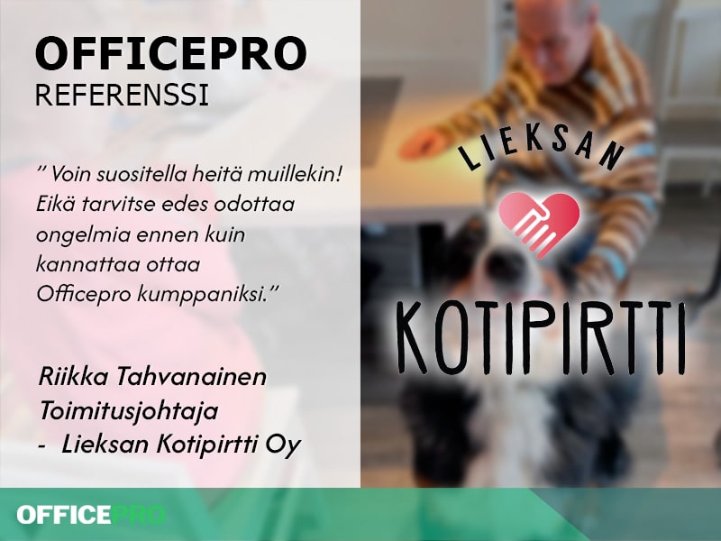 Voin suositella heitä muillekin! Eikä tarvitse edes odottaa ongelmia ennen kuin kannattaa ottaa Officepro kumppaniksi.”