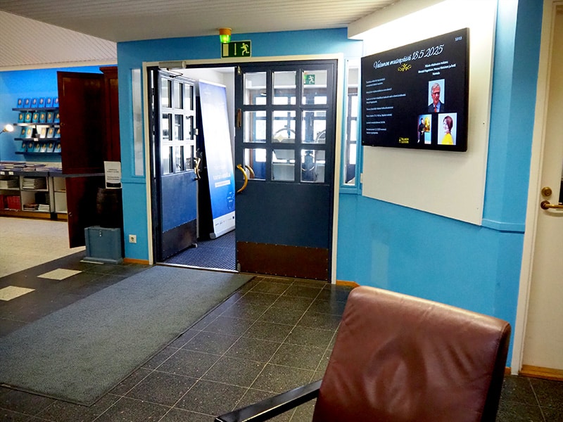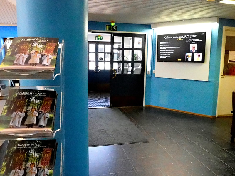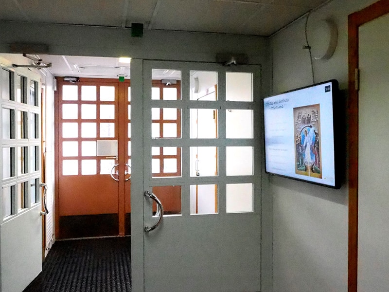 Yksi henkilö hoitaa opiston kurssien osalta viestimistä kahdella näytöllä. Muut, kuten palvelukeskus, ravintola ja kulttuurikeskus ovat enemmän luostarin palveluiden viestimistä. Ravintolan puolella ruokalista on tärkeää tuoda esille ja päivittää. Siinä näkyy koko viikon ruokalista.